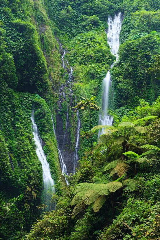 Tebing hijau tinggi, tirai air yang jatuh vertikal, dan cahaya matahari yang masuk dari celah tebing menciptakan efek dramatis alami.