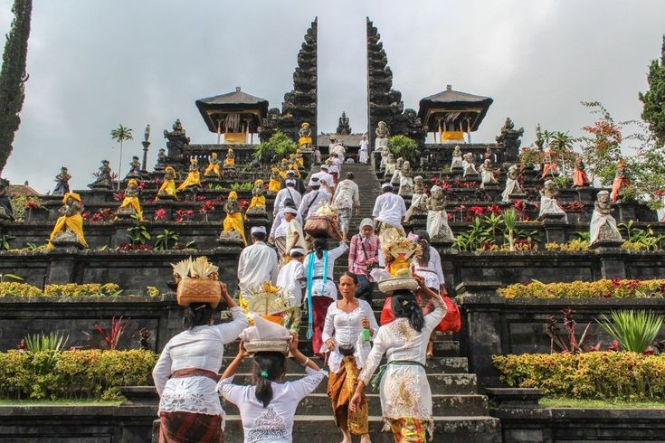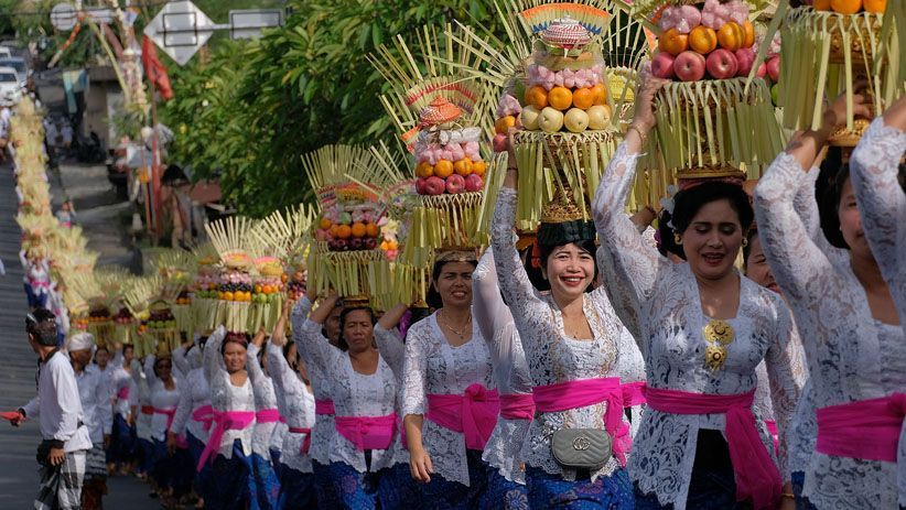Pada hari Galungan, umat Hindu menghaturkan sesajen di pura dan rumah, menyucikan diri, serta menyambut roh leluhur yang dipercaya turun ke bumi. (bali.com)