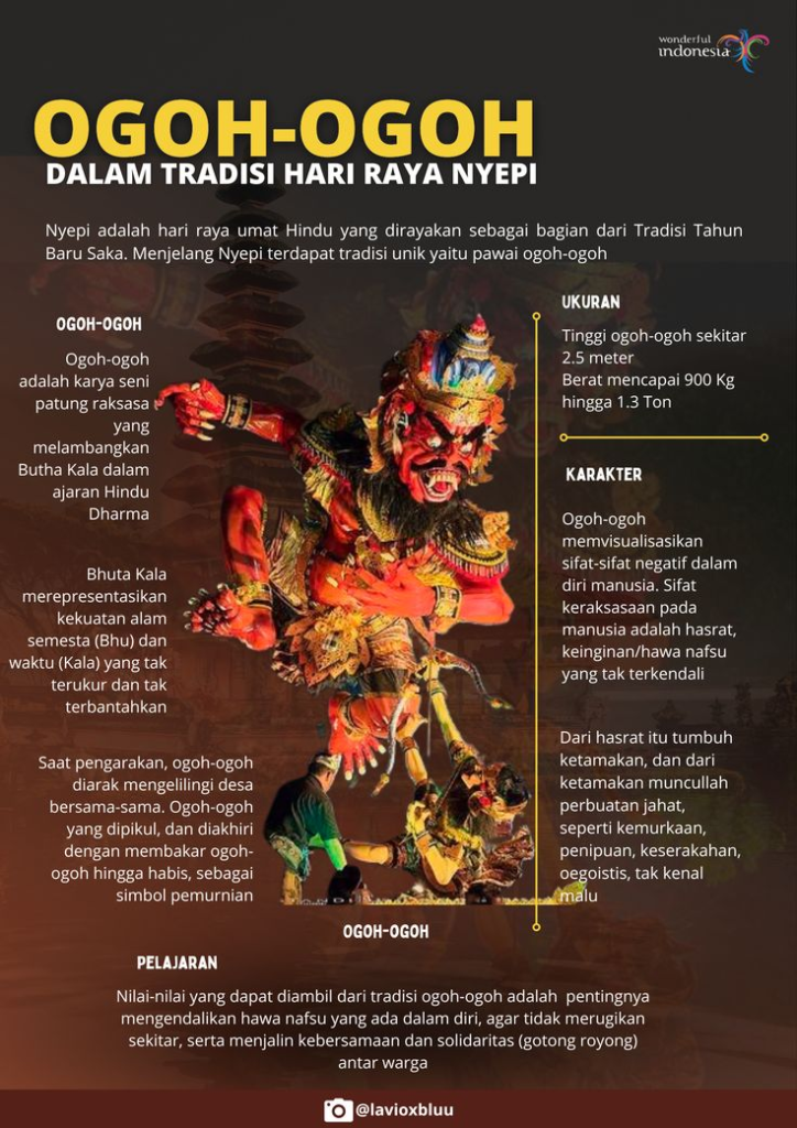 Ogoh-ogoh melambangkan sifat buruk manusia seperti keserakahan, kemarahan, dan kejahatan.