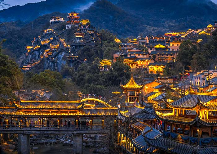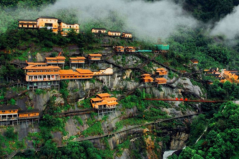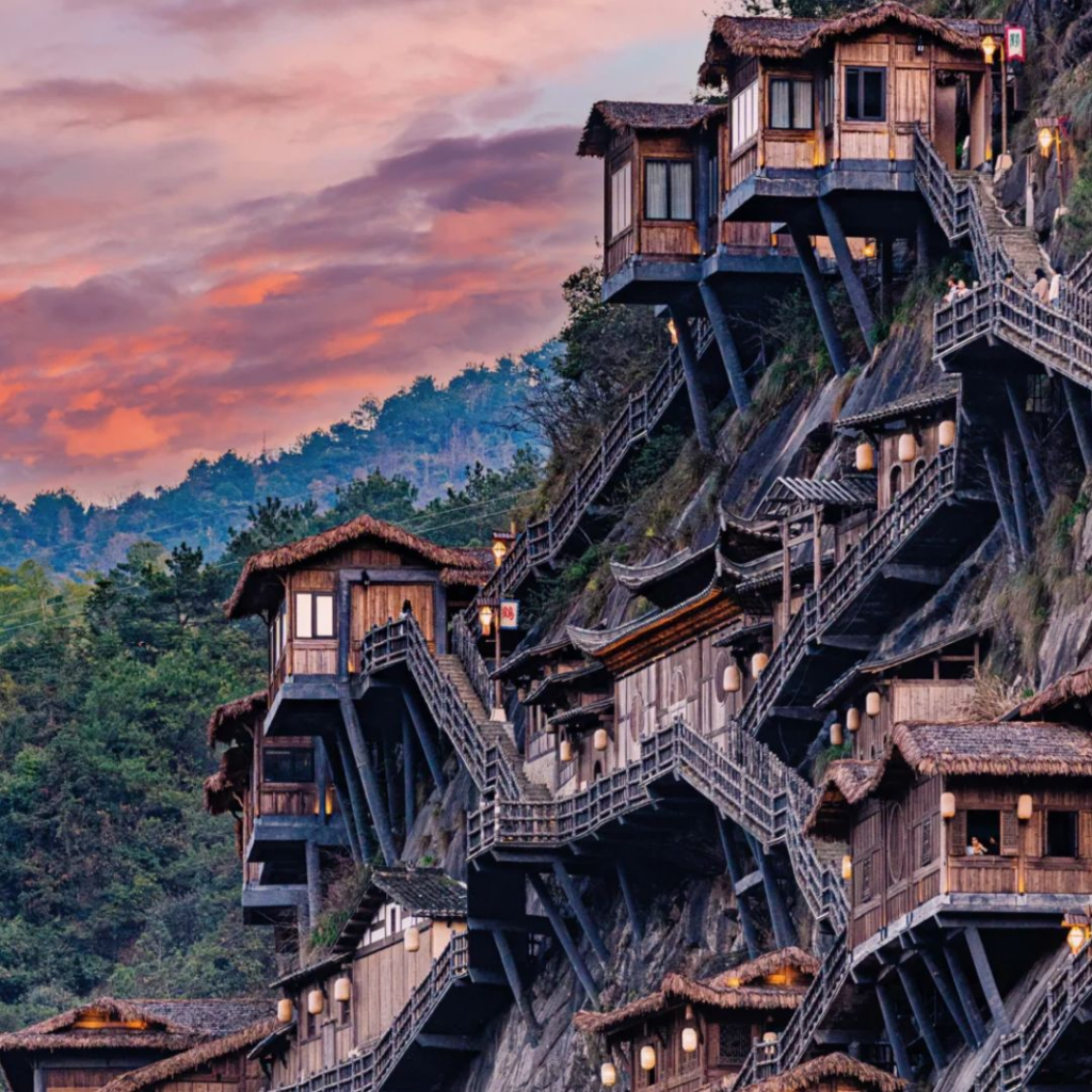 Deretan bangunan kayu tradisional berdiri kokoh di sisi tebing curam, seolah menantang gravitasi ๐Ÿ˜ฒ๐Ÿชต. Saat malam hari, lampion merah menyala dan menciptakan suasana magis seperti di film-film fantasi Tiongkok ๐Ÿฎโœจ